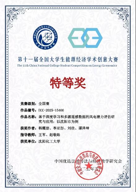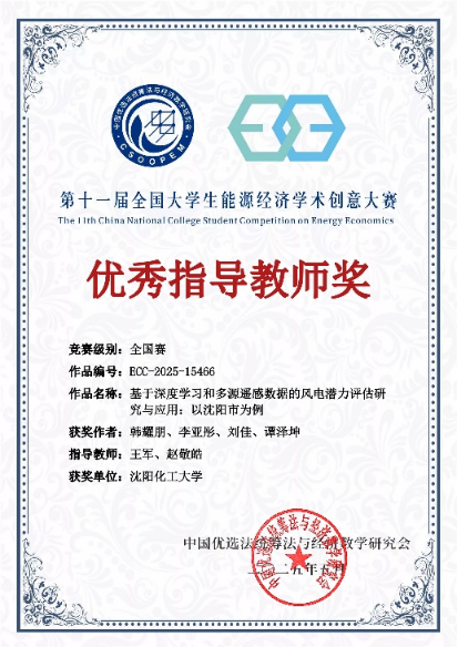 第十一届全国大学生能源经济学术创意大赛总决赛在5 月 24 日至 25 日举行。我校研究生韩耀鹏等学生的作品《基于深度学习和多源遥感数据的风电潜力评估研究与应用:以沈阳市为例》成功进入终审决赛,在激烈角逐中最终斩获全国研究生组特等奖。该作品由我校BEAT365英国官网王军教授和中国科学院青岛生物能源与过程研究所田亚峻研究团队的赵敬皓工程师联合指导,是我校在该大赛中取得的历史最高奖项。