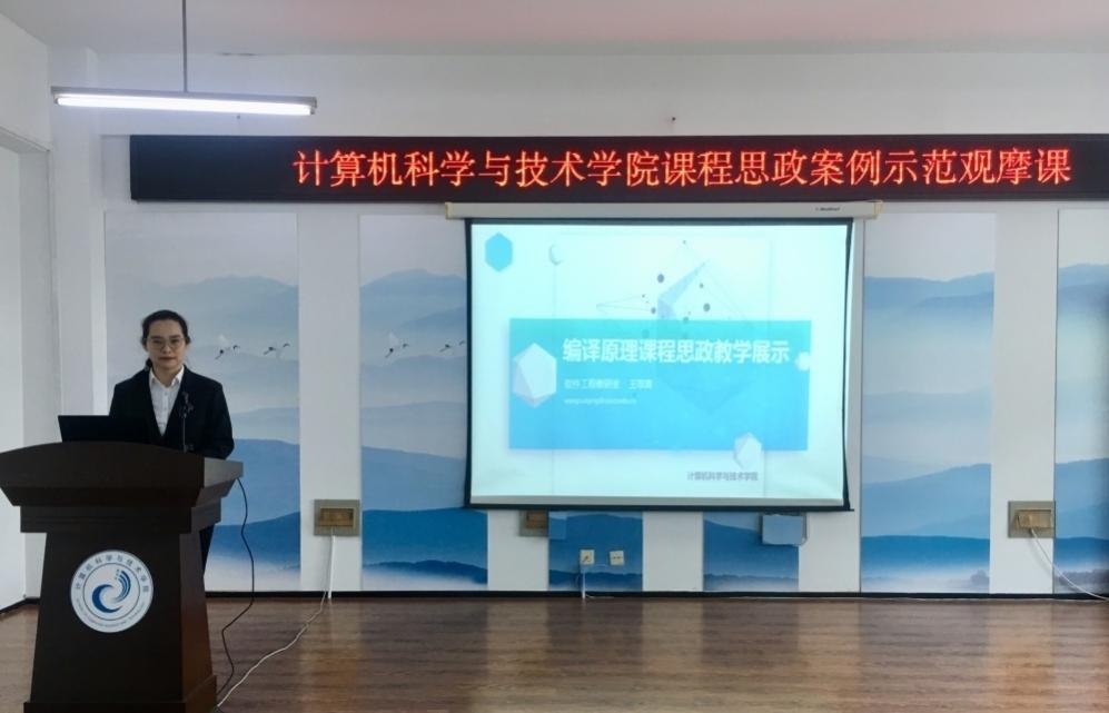 然后,2021年我校教师课程思政能力大赛获奖教师王翠青作示范观摩课。她以编译原理课程为例,从词义分析、语法分析、中间代码优化、编译程序发展历程等方面分享了思政元素的发掘方法,通过案例教学、微课视频、课后小组讨论等教学方法,融入人文因素和情感因素,增强专业课教学的吸引力,提升学生学习的兴趣。